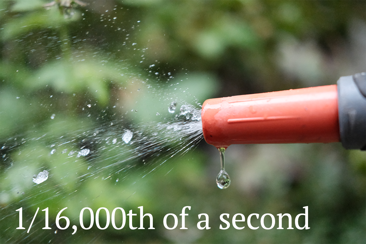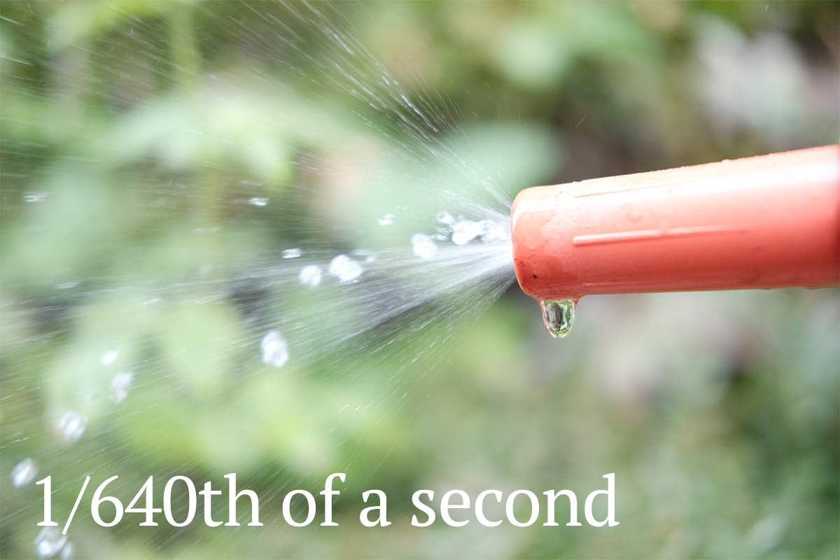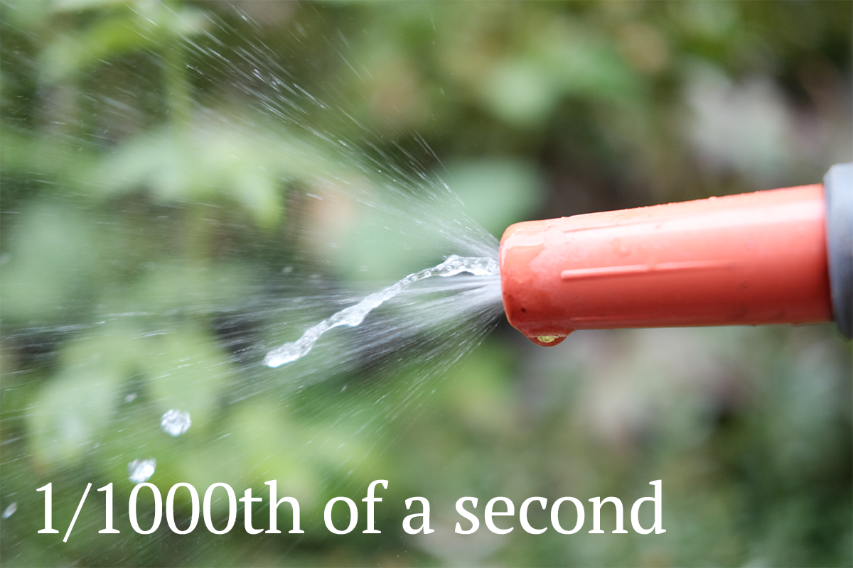 For homework, you’re going to look at how shutter speed affects exposure yourself. So together, let’s look at how shutter speed affects movement and blur. I took some pictures of water coming out of the hosepipe as an example and you shouldn’t read anything Freudian into that.