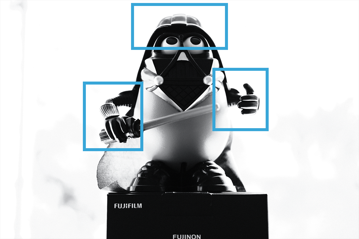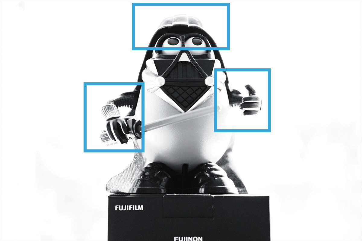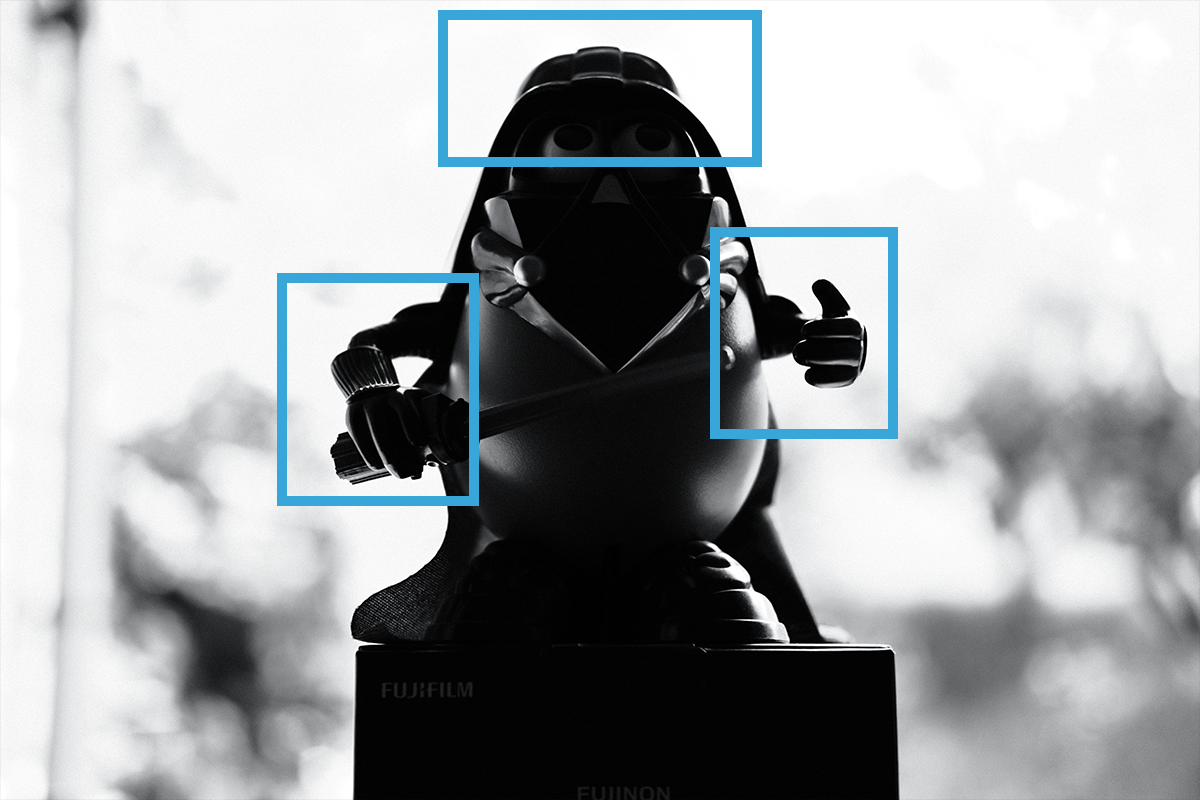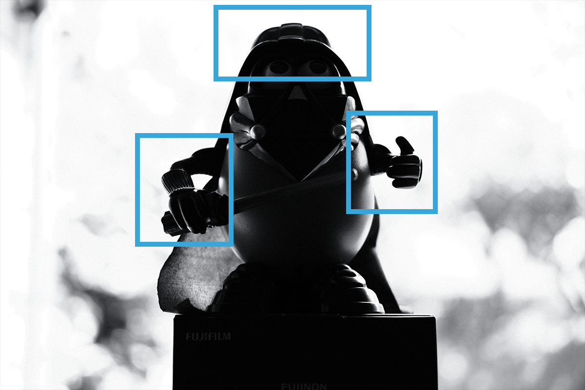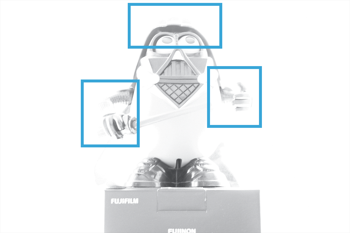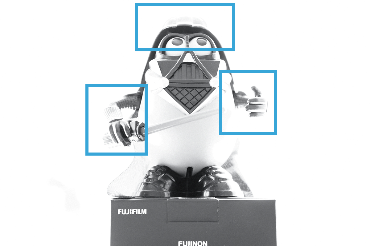 Darth Tater turned out to be the perfect model because of his huge, shiny helmet. There, you can do what you want with that double entendre. The important thing as you look at this series of images is to pay attention in particular to the areas marked in the blue boxes. Watch how the light behaves as we increase the exposure/decrease the shutter speed. For all these images, the aperture is F2 (because we want to blur out the background as quickly as possible) and the ISO is 200. They remain the same and we only change the shutter speed. Also, you don’t have to do it in black and white, I just don’t take colour pictures because I’m very pretentious.
