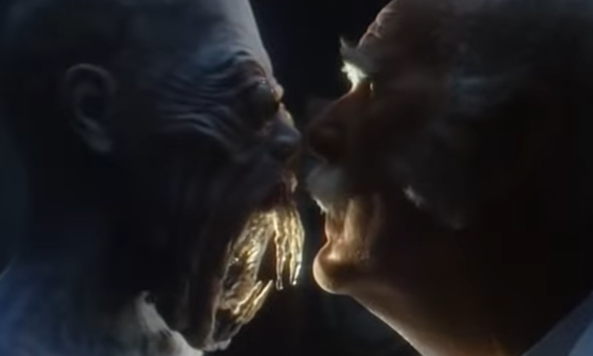 03:38 La Bush, smiling smugly, serves tea to the General and then stands there waiting for his next command. Close-up on 2: wait! The face changes to that of the banshee! This is followed by a montage of all the faces of her victims.