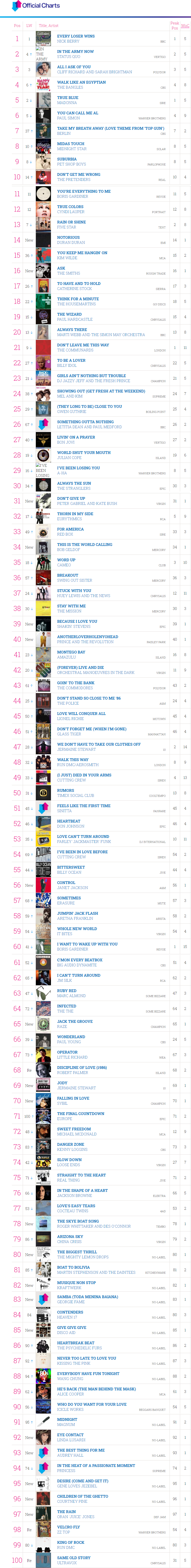 I mean, there are some bona fide classics (“Suburbia”, “Notorious” (yes it fucking is), “Anotherloverholenyohead”) but, Letitia Dean and Paul Medford? Don’t call us, we’ll call you. Also, who knew that Linda Lusardi had tried her hand at pop? A new entry at number 92, it went up one place the week after and that fortnight was the whole of her career in pop.