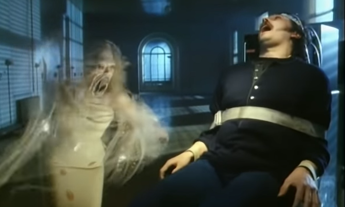 02:32 The Victim looks amazed at this ethereal spirit that has appeared before his eyes out of the top of the broken stereo, especially given how much it looks like his girlfriend. The apparition with the overdrawn lips blows him a kiss and then rips off her wig! It’s a bit like Sasha Velour’s rose petal wig reveal except instead of a bald head, this reveals a hideously angry phantasm in one passed for special effects in 1980s pop videos. The Professor, Assistant 1 and Assistant 2 look startled by this development, as though they hadn’t expected something violent to arise from a brief that read, “a sound that could kill someone”. Hmmm. Assistant 1 does some acting.